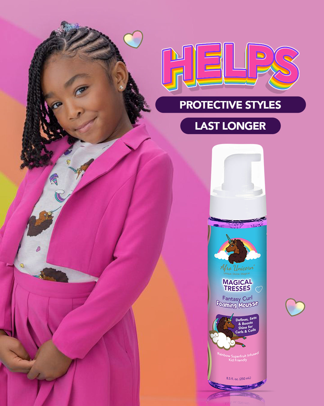 A lightweight, kid-friendly foaming mousse that defines curls, adds brilliant shine, and delivers lasting moisture—perfect for twists, braids, rod sets, and wash-and-go styles.